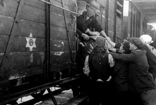 Judeus búlgaros colocam suas bagagens no vagão de trem após terem sido capturados pela polícia e por soldados da Bulgária, colaboracionistas da Alemanha nazista. Sófia