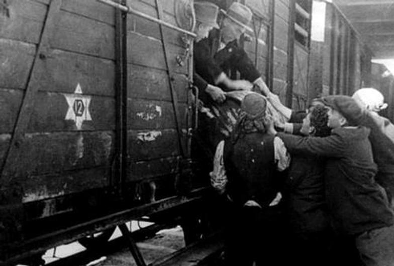 Judeus búlgaros colocam suas bagagens no vagão de trem após terem sido capturados pela polícia e por soldados da Bulgária, colaboracionistas da Alemanha nazista. Sófia, s. d.