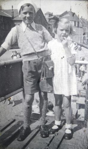 Kirsten Herløv e seu irmão Ule no porto da cidade de Aarhus, próximo ao escritório de seu pai August Osvald Herløv. Aarhus, Dinamarca, 1943