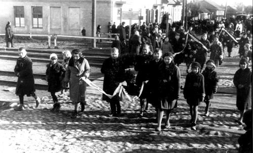 Alunos da escola de Pińsk acompanham o funeral de um amigo morto pelos soviéticos. A coroa de flores é levada pelos irmãos Kazimierz e Jerzy Dubiczynski. Pińsk, 1941.