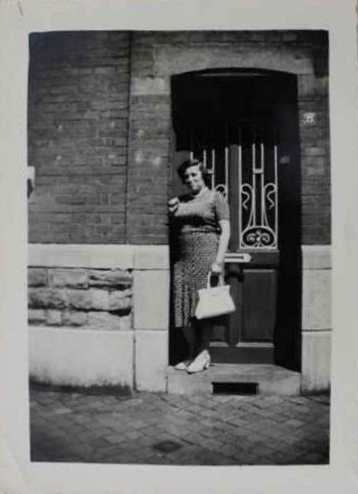 Rywka Gliksman, mãe de Ita Gliksman, em frente a sua residência na Bélgica, depois da Guerra.