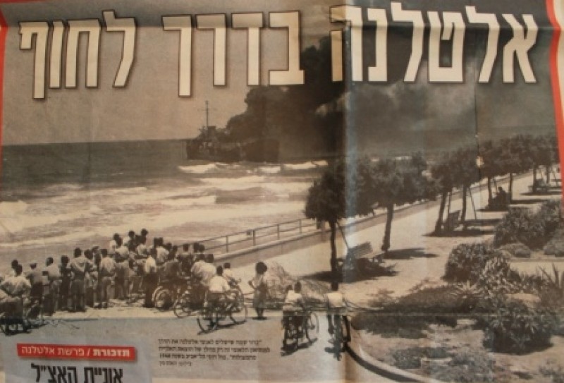Fotografia de um jornal escrito hebraico, com notícias sobre o navio Altelena.