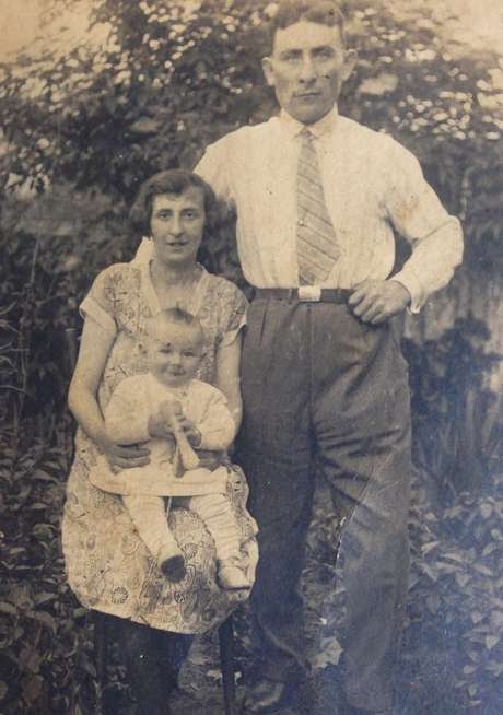 Aleksander Henrik Laks no colo de sua mãe, Syma, e seu pai Jacob Laks. Lodz, Polônia,