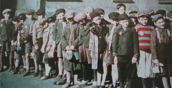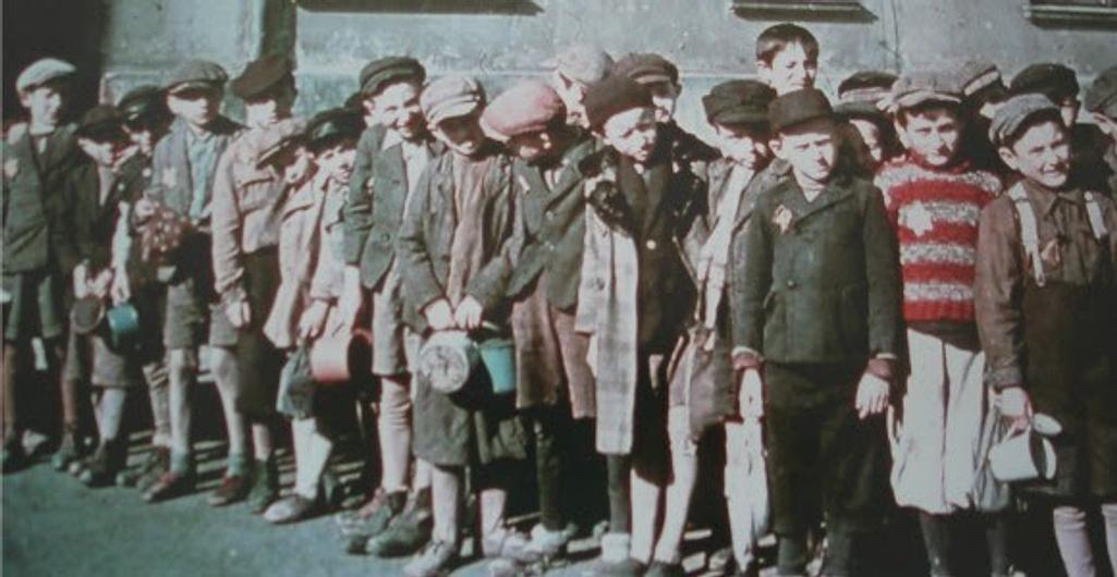 Grupo de meninos judeus em uma escola na Polônia, durante a ocupação nazista. As crianças trazem a estrela amarela costurada à roupa, marca imposta à todos os judeus. Aleksander Henryk Laks, da esquerda para a direita é a oitava criança da fila, o mais alto de boné, sorrindo, entre os colegas da escola.