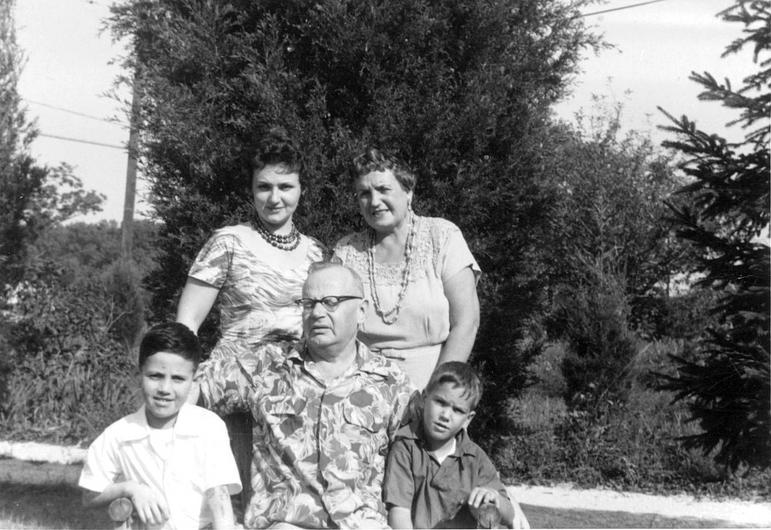 Familia materna de Arie (à esquerda): sua mãe Dusia, seus avós Dora e Saul, e seu primo Larry (à direita). Lakewood, Nova York, 1955.