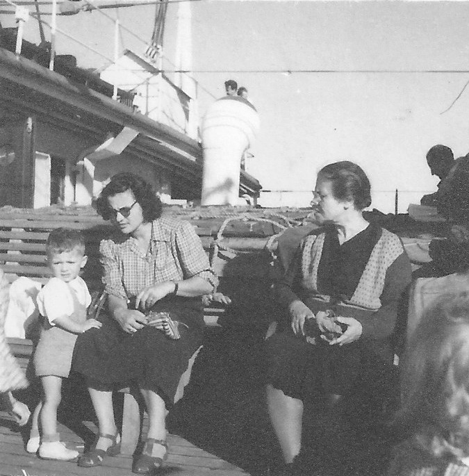 Salvatore Licco Haim com a mãe Berta Haim e Estreja Hasan, a avó materna no navio Jamaique, com destino ao Brasil, 5.10.1948.