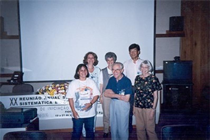 Otto Gottlieb durante a XX RESEM, na FIOCRUZ, Rio de Janeiro, 1998. Entre os vários colaboradores, destaca-se, atrás de Otto Gottlieb, Maria Renata de M. B. Borin.