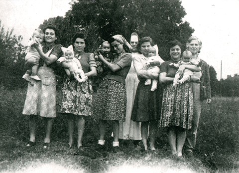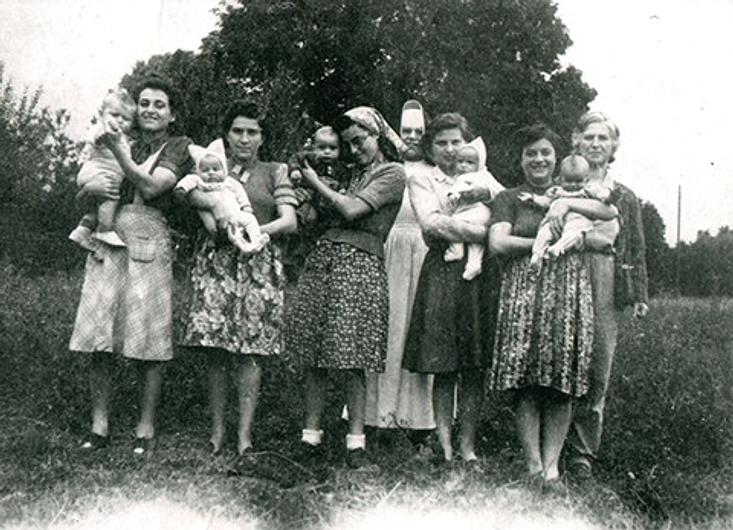 As mães com suas crianças após a liberação do Campo de Concentração de Dachau (Elisabeta, de saia xadrez, com o pequeno George Legmann, primeiros à esquerda). Hospital St. Ottilien, Alemanha, julho de 1945.
