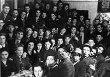 Comemoração judaica, no campo de refugiados (DP Lager) de Berlim-Tempelhof. À esquerda, o casal Malka (sentada) e David Lorber Rolnik (em pé); o casal de primos de David, Hana e Tzvi Vikelman ; Sonia e Pinchas Rolnik, tio de David. Alemanha, c. 1947.