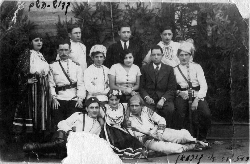 Grupo teatral Studium Dramatycznie -Tarbut da cidade de Wlodawa, durante uma apresentação, com Pinchas (Pinie) Rolnik. Possivelmente em Wlodawa, Polônia, c. 1934/1935.