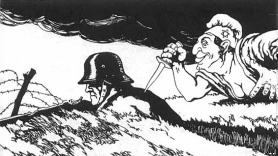 Cartão-postal antissemita ilustrando a lenda da “facada nas costas”