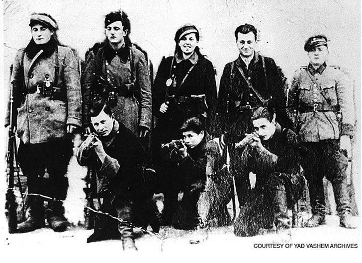 Partisans do grupo Grysnzpan (a partir da esquerda, em pé: Harold Werner, Symcha Barbanel, Dora Grynszpan, Abram Grynszpan e Wladek Litwak; ajoelhados: Chanina Henry Barbane, Abram, Shienka de Wlodawa, s.l.; s.d.