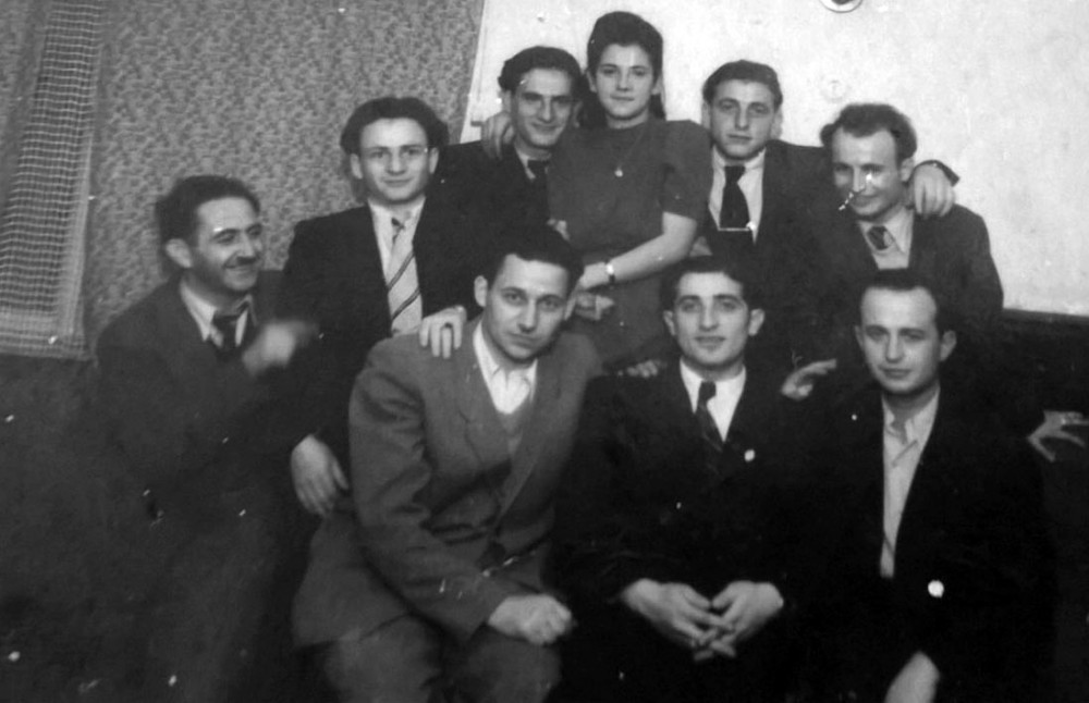 Casamento de Leon Lerner (sobrevivente da revolta de Sobibor) com Mania. Como integrantes do grupo de Grynszpan temos (da esquerda para direita): sentados, Chil Grynszpan e Leon Lerner; em pé: Joseph Rolnik, Wolf Litwak e sua esposa Basia Litwak (ao centro). Bayreuth (Alemanha), c. 1946.