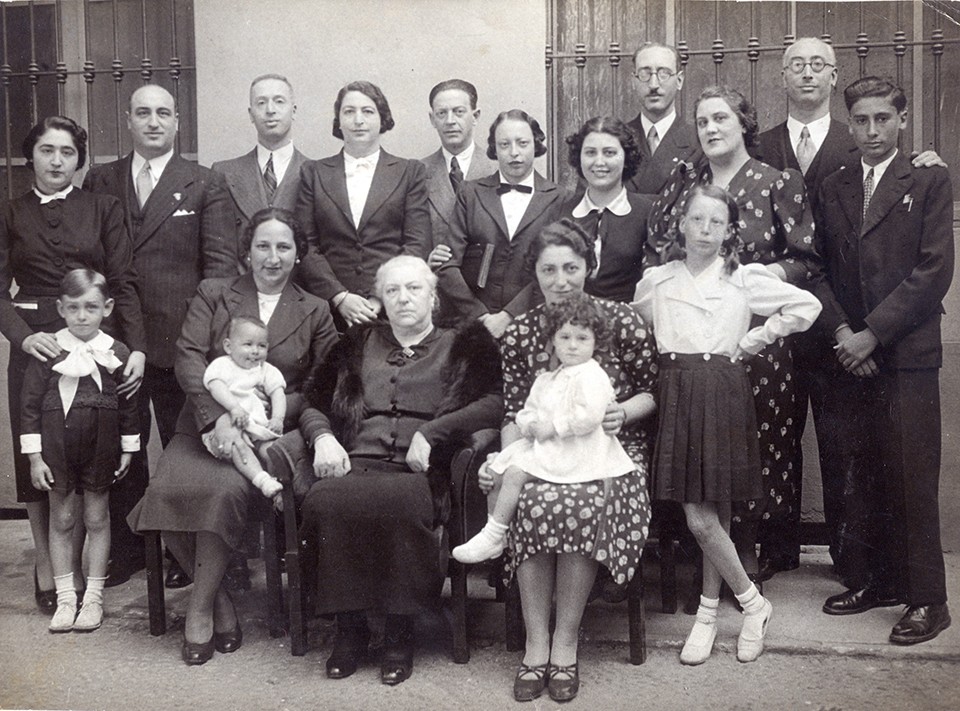 Família Levi reunida para o Bar Mitzvá de Bruno Levi [jovem à direita]. Da esquerda para a direita, em pé: Eda, Carlos Alberto Levi, Vitório Levi, José e Ema Levi. Ao centro a avó de Bruno Levi, Elvira Levi, Milão, 1937.