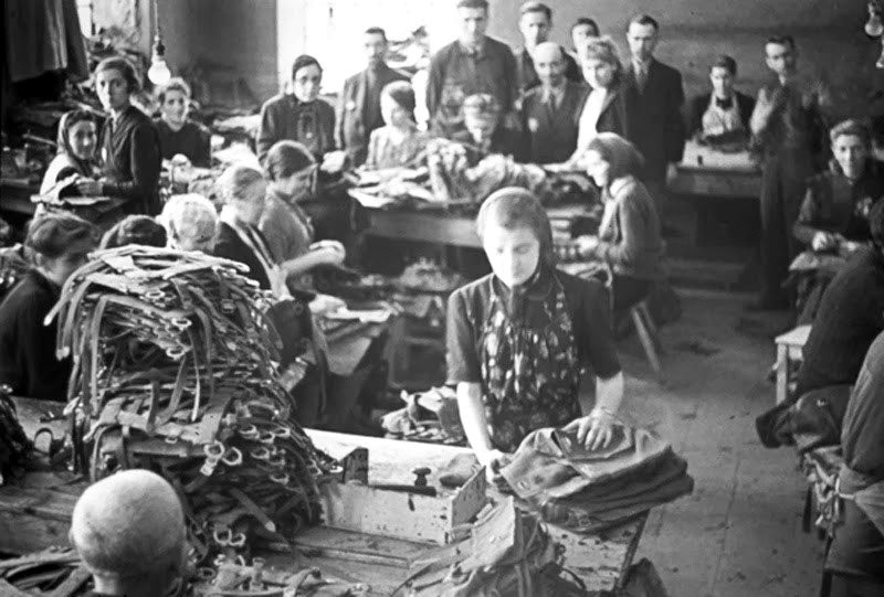 Mulheres trabalhando em uma fábrica no gueto de Łódź, 1943. Fotografia de Walter Genewein, contador-chefe de Hitler.