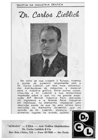 Foto de Karl [Carlos] Lieblich no Boletim da Indústria Gráfica (composição). Em sentido horário: fragmento de entrevista publicada em janeiro de 1953, ano 4, n. 45; o logotipo das empresas Dr. Carl Lieblich & Cia.; endereço da empresa: anúncio publicado em março de 1955, ano 6, n. 62.
