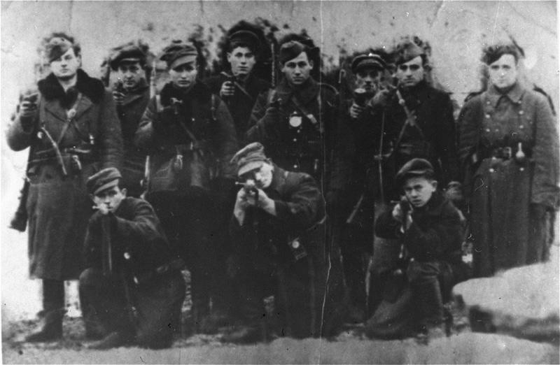 Grupo de partisans judeus comandados por Yehiel Grynszpan nas florestas de Parczew. De pé da esquerda para a direita: Dudkin Rubinstein, Jurek Pomeranc, Lonka Pfefferkorn, Lova (Leon) Zitzman, Chil Grynszpan, Yehuda Junak Milsztajn, Josef Rolnik, russo desconhecido. Ajoelhados da esquerda para a direita: Abie Rubinstein, Henry Barbanel e Kirlow Rubinstein, provavelmente em 1943.