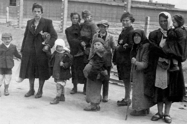 Após a seleção, mulheres judias com seus filhos caminham para as câmaras de gás