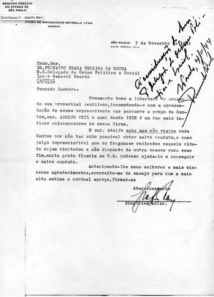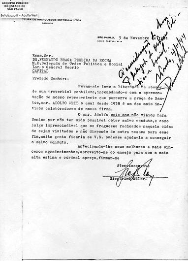 Carta de Siegfried Adler a Fernando Braga Pereira da Rocha, delegado do Deops/SP, apresentando Adolfo Weil, funcionário da Estrela. S. Paulo, 3 de novembro de 1944. Fundo DeopsAPESP/SP.