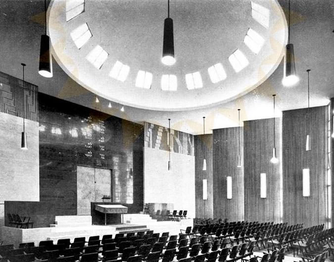 Vista geral do templo da CIP, projetado por Henrique Mindlin e iluminado por Lívio Edmondo Levi (1933-1973)