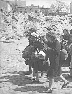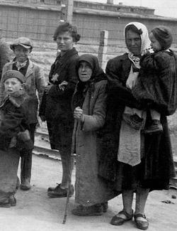 Após a seleção, mulheres judias com seus filhos caminham para as câmaras de gás
