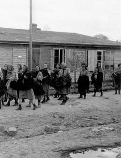 Mulheres destinadas para o trabalho escravo caminhando para os barracões após seleção e o registro