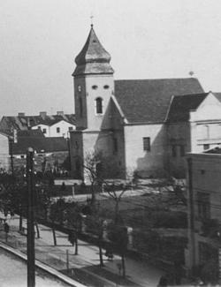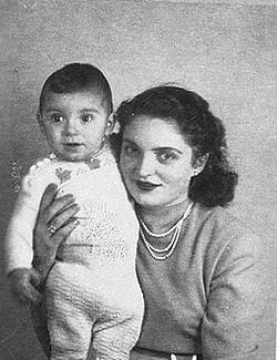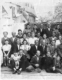 Sobreviventes da cidade de Bełchatów, entre os quais estão as irmãs Dvoireh Klug, radicada em Buenos Aires, na Argentina, e Dina Jakubowicz, nascida Klug. Ao seu lado está Berek [Beirish] Jakubowicz, seu marido (de pé ao f, na Argentina, e Dina Jakubowicz