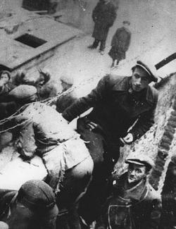 Judeus pulam a parede do gueto. Berek Jakubowicz, marido de Dina Klug Jakubowicz, aparece na fotografia à direita e abaixo