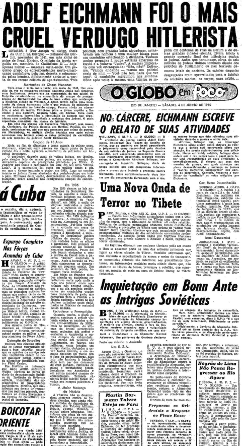 Matéria de Joseph W. Grigg, chefe da UPI na Europa, que relembra o extermínio de judeus durante o Holocausto. Em seu texto, Grigg explicita a escalada da perseguição, violência e extermínio do povo judeu, assim como salienta o papel de Adolf Eichmann nesse processo. Em matéria ao lado, o jornal O Globo informa que Eichmann está cooperando plenamente com seus inquiridores israelenses; que sua família partiu da cidade de San Fernando, na Argentina, com destino incerto; e que, segundo o jornal Jerusalem Post, Israel pretende negar qualquer tipo de envolvimento no sequestro de Adolf Eichmann.