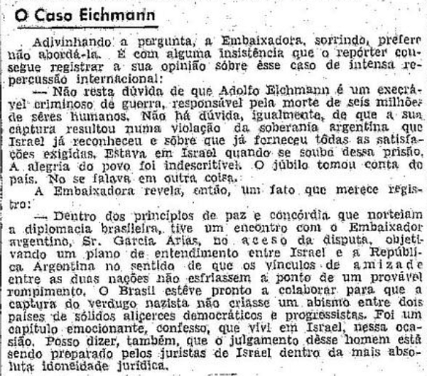 O jornal O Globo repercute a entrevista de Odete de Carvalho e Sousa, embaixadora brasileira em Israel. De férias no Brasil após chefiar a representação diplomática brasileira em Tel Aviv durante 14 meses, Odete comentou sobre alguns dos assuntos suscitados pela reportagem. Após relutar em responder o questionamento do repórter, Odete de Carvalho e Sousa disse que "não resta dúvida de que Adolf Eichmann é um execrável criminoso de guerra, responsável pela morte de seis milhões de seres humanos. Não há dúvida, igualmente, de que a sua captura resultou numa violação da soberania argentina que Israel já reconheceu e sobre que já fortaleceu todas as satisfações exigidas. Estava em Israel quando soube dessa prisão. A alegria do povo foi indescritível. O júbilo tomou conta do país. Não se falava em outra coisa". Por fim, a embaixadora revela detalhes sobre a participação do Brasil na resolução do conflito entre Israel e Argentina.