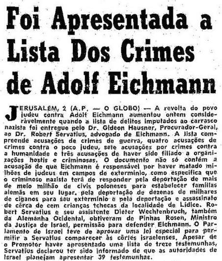 O jornal O Globo repercute os detalhes da lista de acusações entregue por Gideon Hausner, procurador geral de Israel, a Robert Servatius, advogado de Adolf Eichmann. Há ainda a informação de que Servatius e seu assistente, Dieter Wechtenbruch, obtiveram permissão especial para defenderem Eichmann durante o processo.