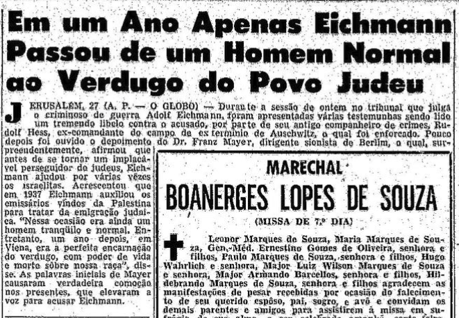 Matéria repercutindo os novos acontecimentos do julgamento de Adolf Eichmann em Israel. Segundo a notícia, "foram apresentadas várias testemunhas sendo lido um tremendo libelo contra o acusado, por parte de seu antigo companheiro de crimes, Rudolf Hess, ex-comandante do campo de extermínio de Auschwitz". Franz Meyer, "dirigente sionista de Berlim", também foi ouvido durante a sessão. Meyer afirmou que "antes de se tornar um implacável perseguidor de judeus, Eichmann ajudou por várias vezes os israelitas. Acrescentou que em 1937 Eichmann auxiliou os emissários vindos da Palestina para tratar da emigração judaica. 'Nessa ocasião era ainda um homem tranquilo e normal. Entretanto, um ano depois, em Viena, era a perfeita encarnação do verdugo, com poder de vida e morte sobre nossa raça'".