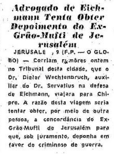 Em nota, o jornal O Globo informa que Robert Servatius, advogado de Adolf Eichmann, e seu auxiliar, Dieter Wechtenbruch, estariam tentando obter "a concordância do Ex-Grão Mufti de Jerusalém" para que este, sob juramento, depusesse em favor de seu cliente.